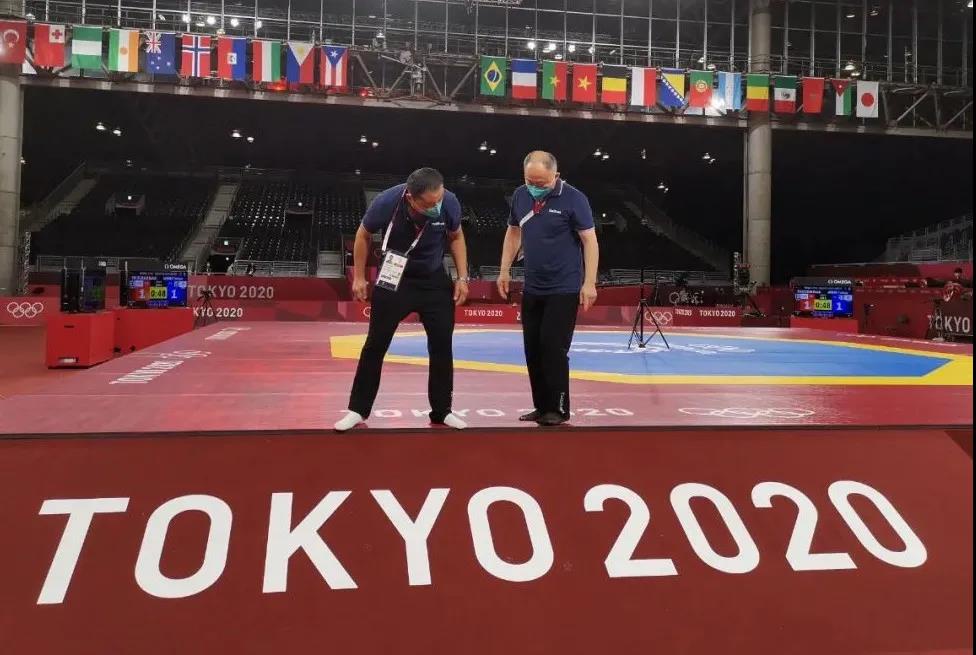 2021年7月20日,日本武道馆——奥运会柔道比赛场地。365WM完美体育东京奥运会服务保障团队正在布置、安装柔道器材。