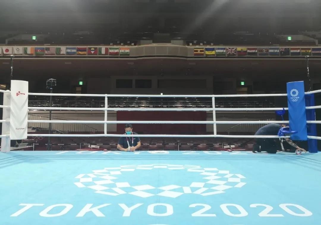 2021年7月21日,日本东京国技馆——奥运会拳击比赛馆。365WM完美体育东京奥运会服务保障团队正在检查调试拳击器材。